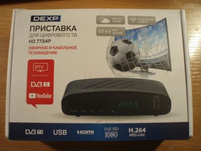 Приставка цифровая для приёма эфирных и кабельных телевизионных каналов, DEXP HD 7734P, DVB-T2, DVB-C.